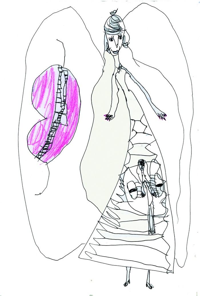Мимо пробежала компания молодых людей, не обратив внимания на его обнажённую спутницу. «Странно», — подумал он. Она же, нисколько не стесняясь, увлекала его дальше по мокрым улицам. Они зашли в метро, пройдя мимо спящего контролёра. Сели в электричку, где спал пьяный запоздалый пассажир.