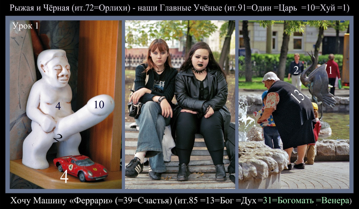 Из-за большого объёма информации и задействованного ресурса на диске, время просмотра текстов и картинок местами пришлось свести до 5-7 сек, поэтому пользуйтесь паузой. Важно заметить, что одним из первопринципов расшифровки писаний, изображений и событий, является лексика от Матери, признанная сегодня завоевателями Мира сего, ненормативной, о чём скорбел и академик Лихачёв. Что касается чисел, то принцип пересчёта и подбора эквивалентных числам слов, вы сможете изучить только по книге. Подставленные в скобках слова, в первую очередь устраняют необходимость многословно объяснять суть сокрытого или зашифрованного. И наперво нужно запомнить, что числа имеют одно значение при чтении наоборот: 13 = 31, а 0 не считается: 301=13=31=4, трёхзначные состоят из двух чисел: 126 – 12 и 26, а сведённое до одного знака, сжимает и обобщает информацию; сокращение (ит. - - -) объединяет сумму слов от последнего знака препинания. На некоторые песни в инете вы можете найти не менее символичные клиповые трактовки, равно как и в любом жанре параллели. Фильм делался в основном спонтанно, без оглядки и надуманной постановки, и главной задачей было минимальными средствами быстрее внести ясность, поэтому могут быть некоторые повторы. В итоге всё получилось как бы задом наперёд и начало делалось последним и первая песня «Введения» оказалось финальной, а когда снимался чемодан, в тот же день найденный на помойке, то вообще было не понятно зачем?.. На следующий день из-за угла выскочили девочки с летающей тарелкой, и последним оказался снимок влюблённых на перекрёстке. По этому спонтанно-бессознательному принципу выстраивались почти все сюжеты, к тому же все клипы, за исключением одного [«128 лет» Агутина], были увидены впервые и мысль о клиповом сериале появилась только после съёмки второй части, снятой уже после всех инсценировок дочери, так что нумерация и названия частей достаточно условны. Но в итоге в «Введении» заложилась основа, и читать там придёться больше, чем в следующих, и всё же не сразу всё всем будет понятно.