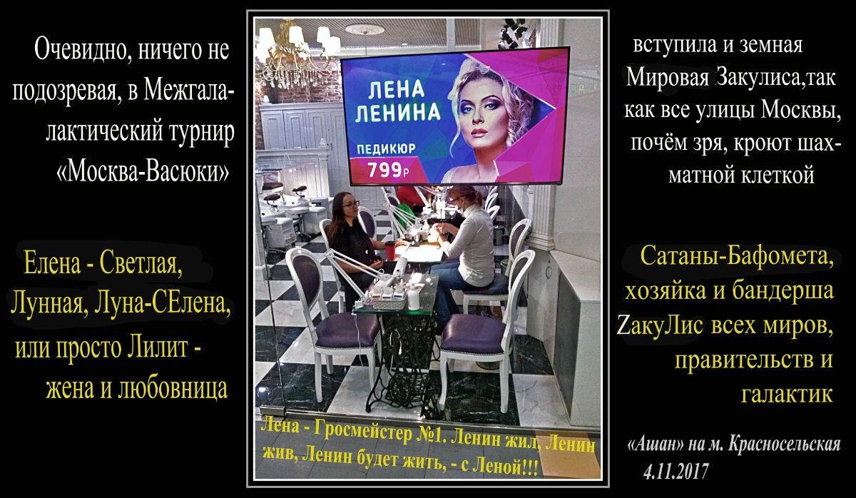 Стоит также отметить, что все мои 20-летние литературные мытарства начались с явления в конце 1996 г. приведений в лице Александры и Николая II и последующего телефонного звонка и встречи с Женщиной в белом, Самой Великой Брюнеткой в стиле Кармен (=30= Зверь =Лилит), с манерами и чертами благородной выездной лошади. Звонок с приглашением был 26-го, а встреча произошла под утро 27 марта 1997-го, в День Театра, Внутренних Войск и основания Династии Романовых, Фёдоровской иконы, и долгая снежно-дождливая погода сменилась солнечной. Увидев её, я понял, что всю жизнь искал и любил только её, где-то видел, только не помню где?.. И так, как она на меня смотрела, проникая в душу безмятежно-безмерной и слегка по-детски искренней любовью совершенно родного человека, частью тебя, – не смотрела на меня ни одна из моих многочисленных жён и подружек, в том числе и мать. Всё, что она мне с нежной улыбкой телепатически сказала в ответ на мой заурядный мысленный вопрос, это: Ирина, назвала два номера телефона, отвернулась, сделала шаг от камина к окну и исчезла, а я полетел в трубу. И после того как я с номерами в голове очнулся на кровати, то сразу стал звонить, – везде жили Ирины, да только не те. В итоге, их даты рождения, имена близких и прочие числа, заставили глубоко задуматься и кинуться на поиски её и причин происшедшего, и погрузиться в до селе немыслимые сравнительные анализы и расчёты. Но что такое телефонный звонок, – казалось бы куда банальней и обыденней, но как и в каких ситуациях и инсценировках он преподносится... – вы можете теперь заметить во многих произведениях, как, например, в «Мастере и Маргарите», – Мастер (=33), Маргарита (=33), Ромео (=34), Джульетта (=34); даты, имена и номера телефонов, квартир и домов, похожих на таинственную обманщицу, тоже оказывались одинаковыми… И так во всём, и чем таинственнее, загадочнее, сюрнее, смешнее и даже глупее и похабнее, тем значительнее. Особенно богаты символизмом фильмы Феллини, Дэвида Линча, Хичкока, Тарковского, Гайдая, Шахназарова, Рязанова и т.п. Советую обратить внимание на «Город женщин», «8 и 1/2», «Счастлива жизнь», «Голова-ластик», «Человек-слон», «Сдохни», «Солярис», «Город Зеро», «Обыкновенное чудо», «Принцесса Турандот», «Тупой и ещё тупее», «Страсти по Анджелике» с А. Самохиной; в том числе и на французкие с итальянскими в целом, и всех не перечислить. Но прежде чем понять их сакральную суть, для начала посмотрите наш фильм. И если вы хотите узнать что вас ждёт в Аду, – смотрите кровавики действительно сумасшедших производителей, – там и без второго плана всё понятно, и кто их снимал, оплачивал и показывал, тот и будет получать то, что представил; но второй план всегда указывает на истинных хозяев положения будущих шашлычков и роботов. В этой мерзости синематографа только один плюс – по ним вы достоверно узнаете, чем живут сильные Мира сего, – правители Земной Мировой Закулисы, из-за которых мы вместе с планетой встали на край бездны и уже безвозвратно обречены. Нет на сегодня в мире ни одной законодательной системы и религиозной догмы, в том числе и масонской, которая не была бы нацелена на отрыв человека от прямого контакта с Высшим Разумом, Богом, – всё под любым красивым словцом и недоговоренной правдой нацелено на подчинение воли и разума в угоду Земной Закулисы. Мы же не провозглашаем догмы и не читаем морали, 