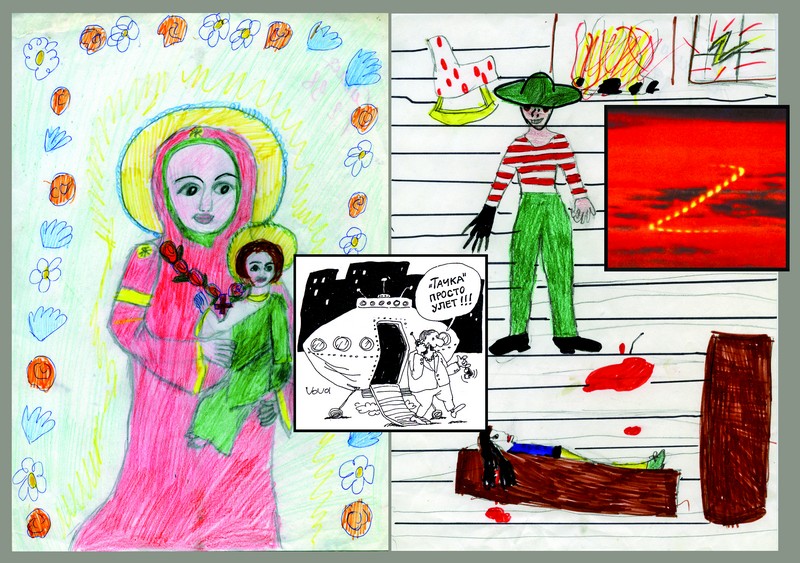 Два лика сатаны (ит.49=Богородица =Вечный жид) сочетании красного и зелёного 14 и красного-белого 18. Рисунки второй дочери Саши, 6 лет: Мария и Иисус (=25), 25/7.2.1998 (9+27=36 + с.с. =43=7). «Фреди Крюгер» (25+36=61=Zeta =7) нарисован в роковую дату будущей гибели башен-близнецов: 29/11.9.1997 / Шоу (=18=Зета) в небе из журнала «НЛО» / Из сборника карикатур «На троих», Омск, 200 г. Художники: Игорь Варченко, Владимир Иванов, Александр Пашков, стр. 92 (=Плеяд): «Тачка» (=14) просто улёт (43+16=59=14).